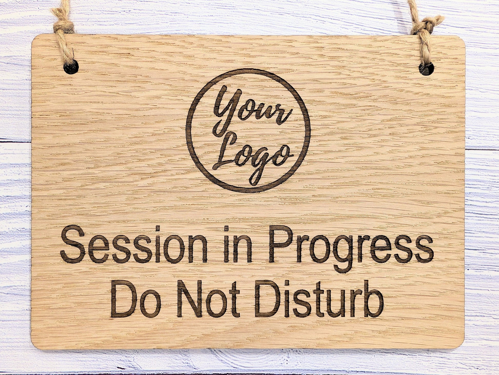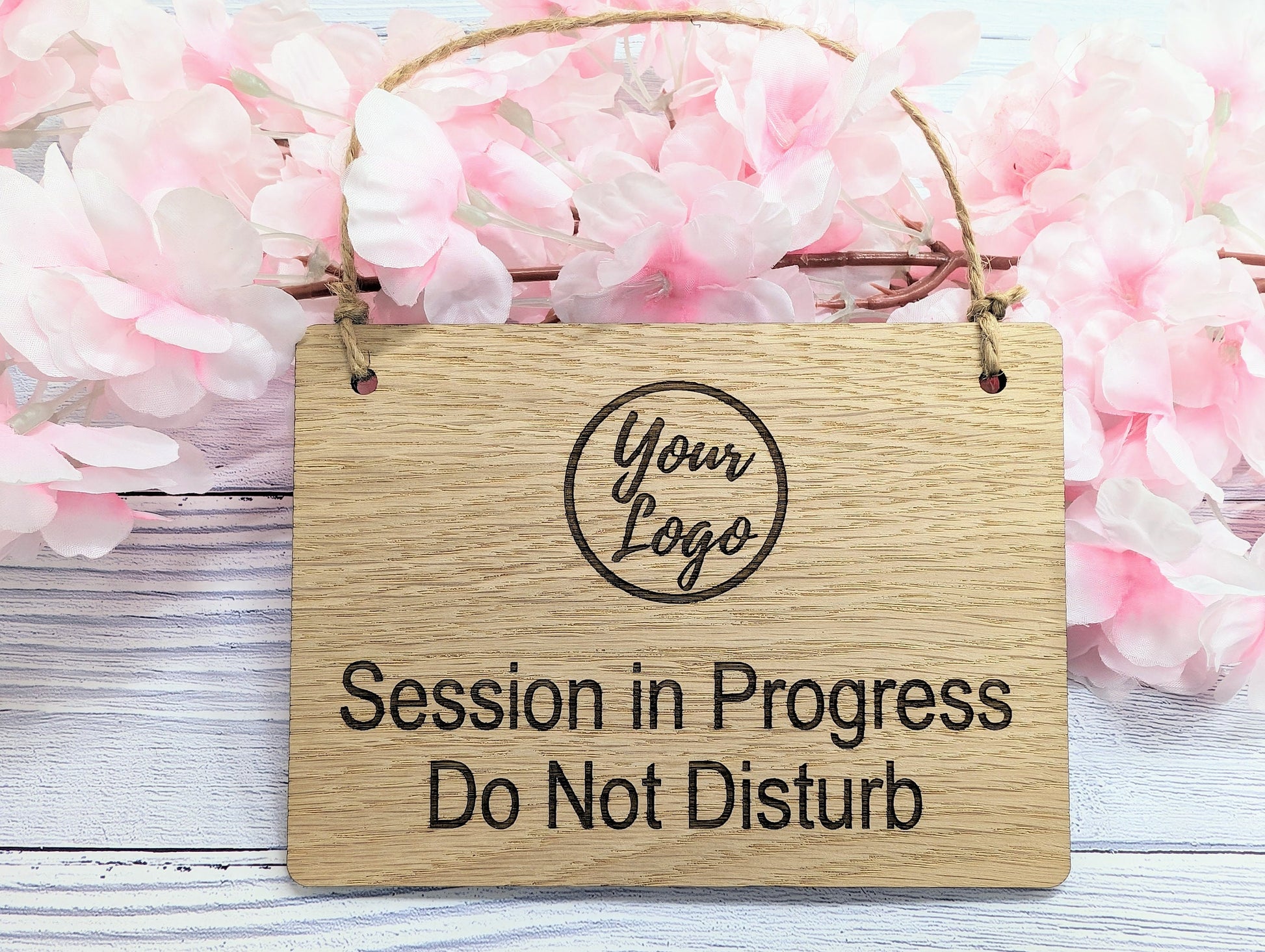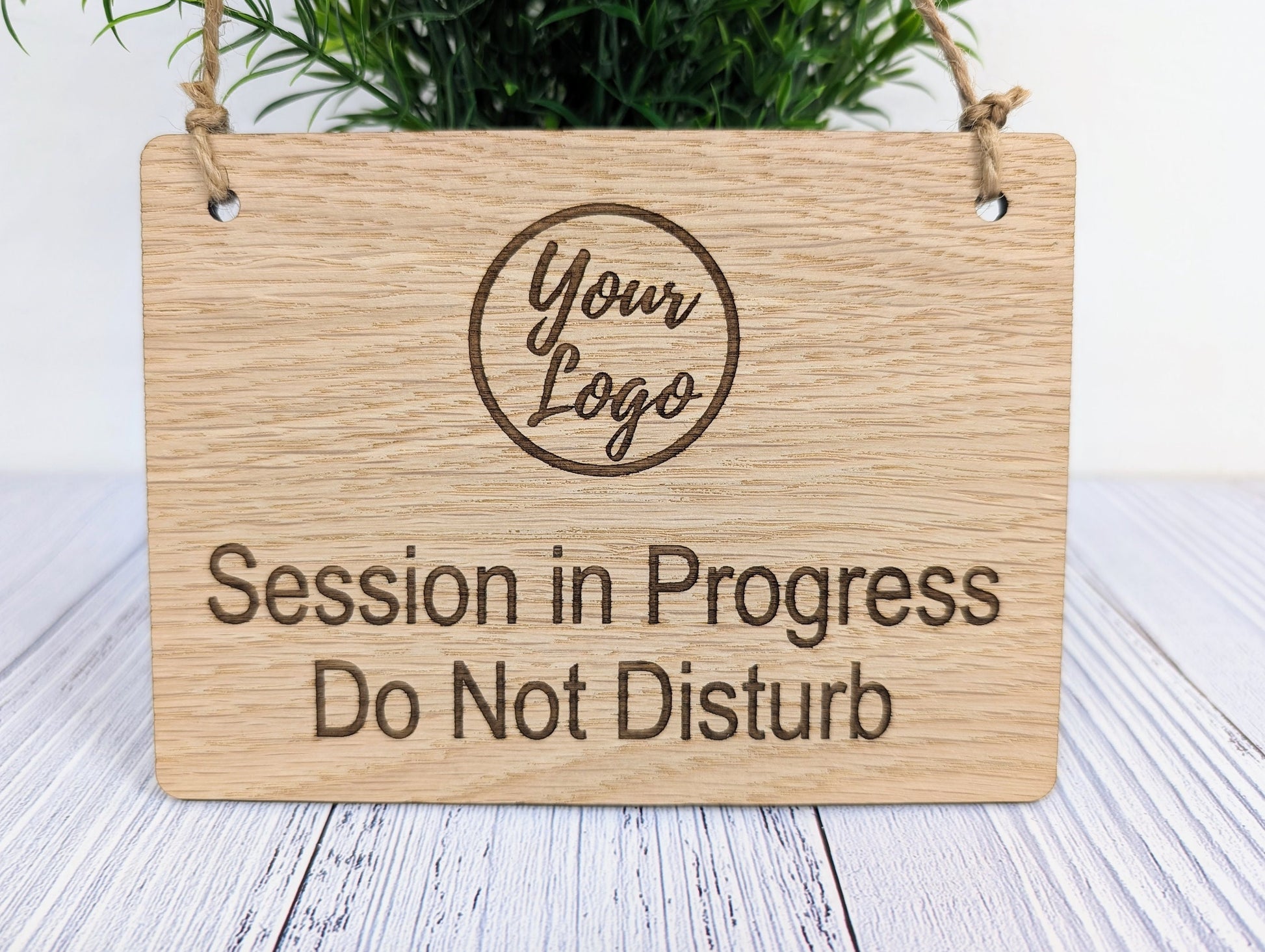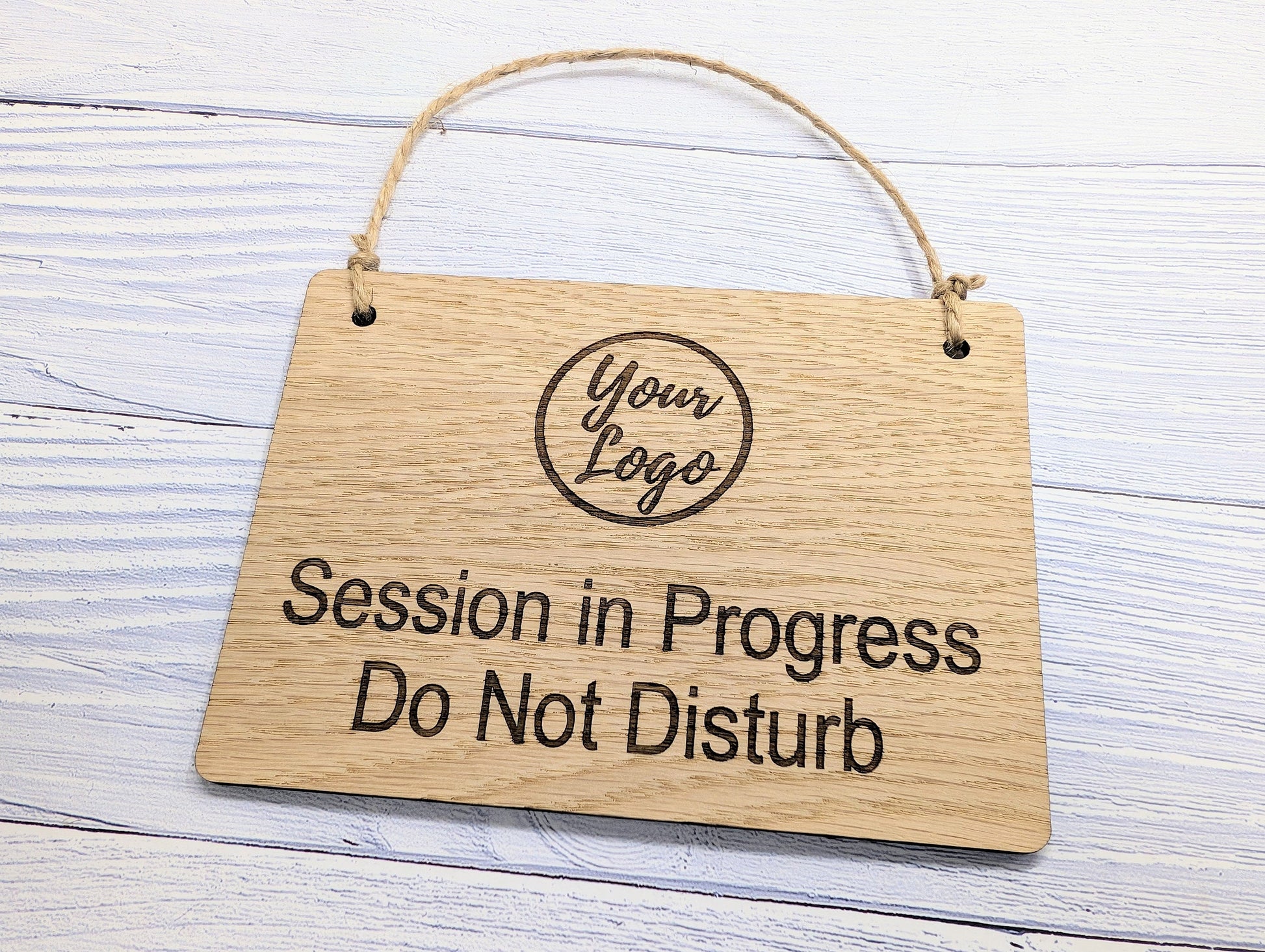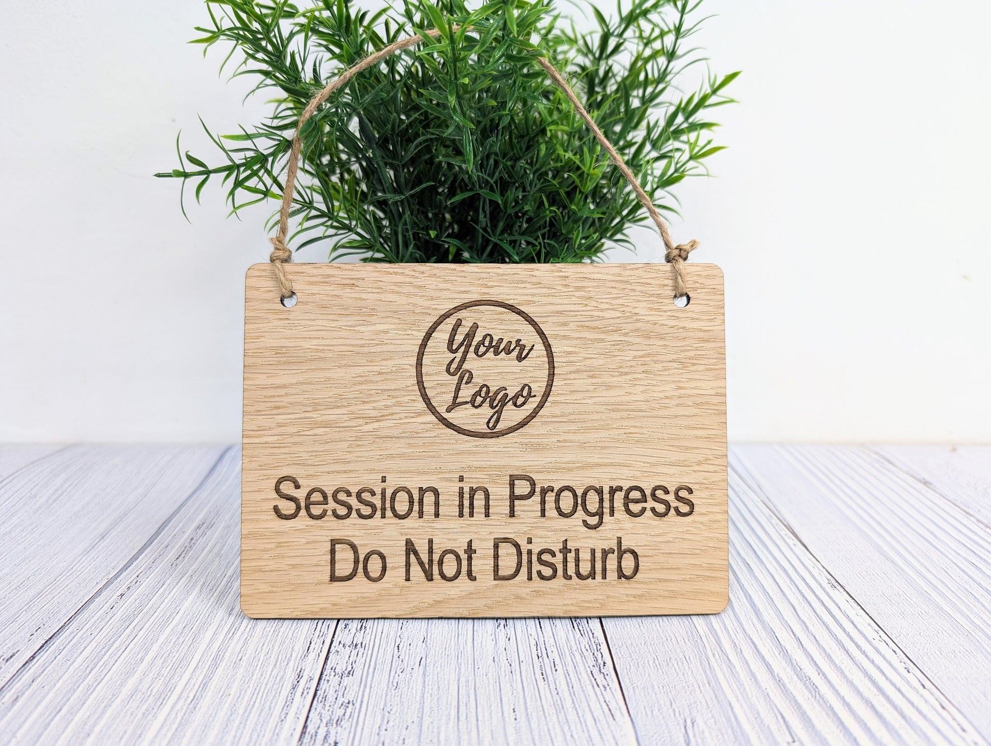 Session in Progress, Please Do Not Disturb - A gentle yet clear way to ensure tranquility. Made from oak veneered MDF, this sign is not just a functional item but a beautiful addition that speaks of professionalism and care.
