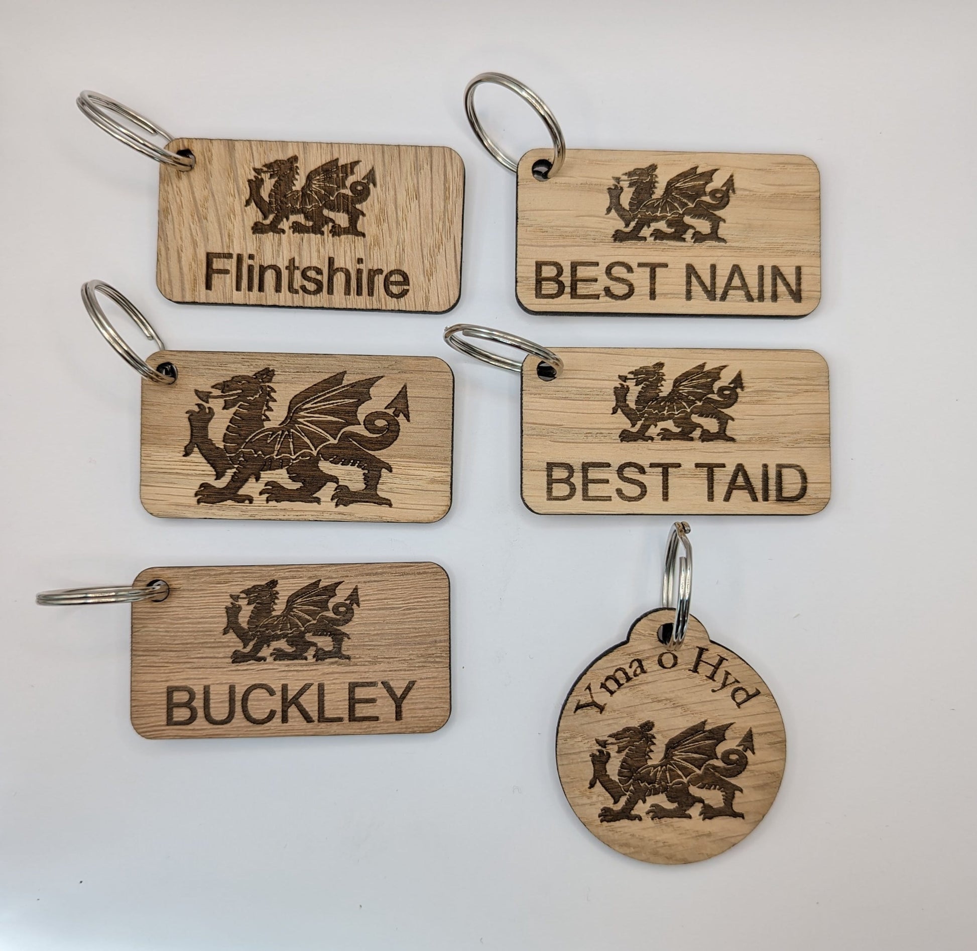 This Welsh keyfob is made from a beautiful oak wood veneered MDF, which is laser precision cut to shape and Laser engraved. It measures 65mm x 35mm. Everything is handmade at home in Wales and produced on demand.
