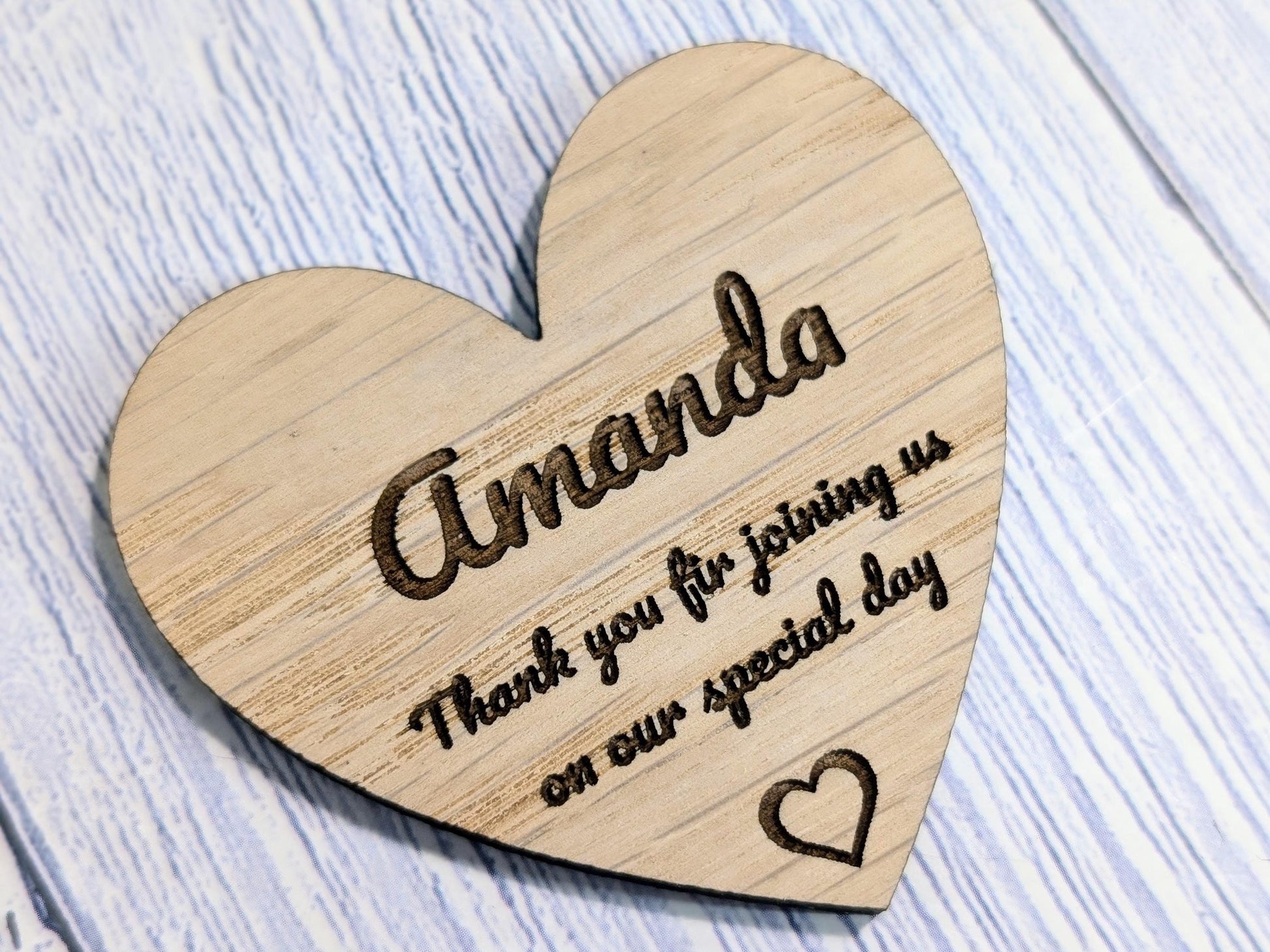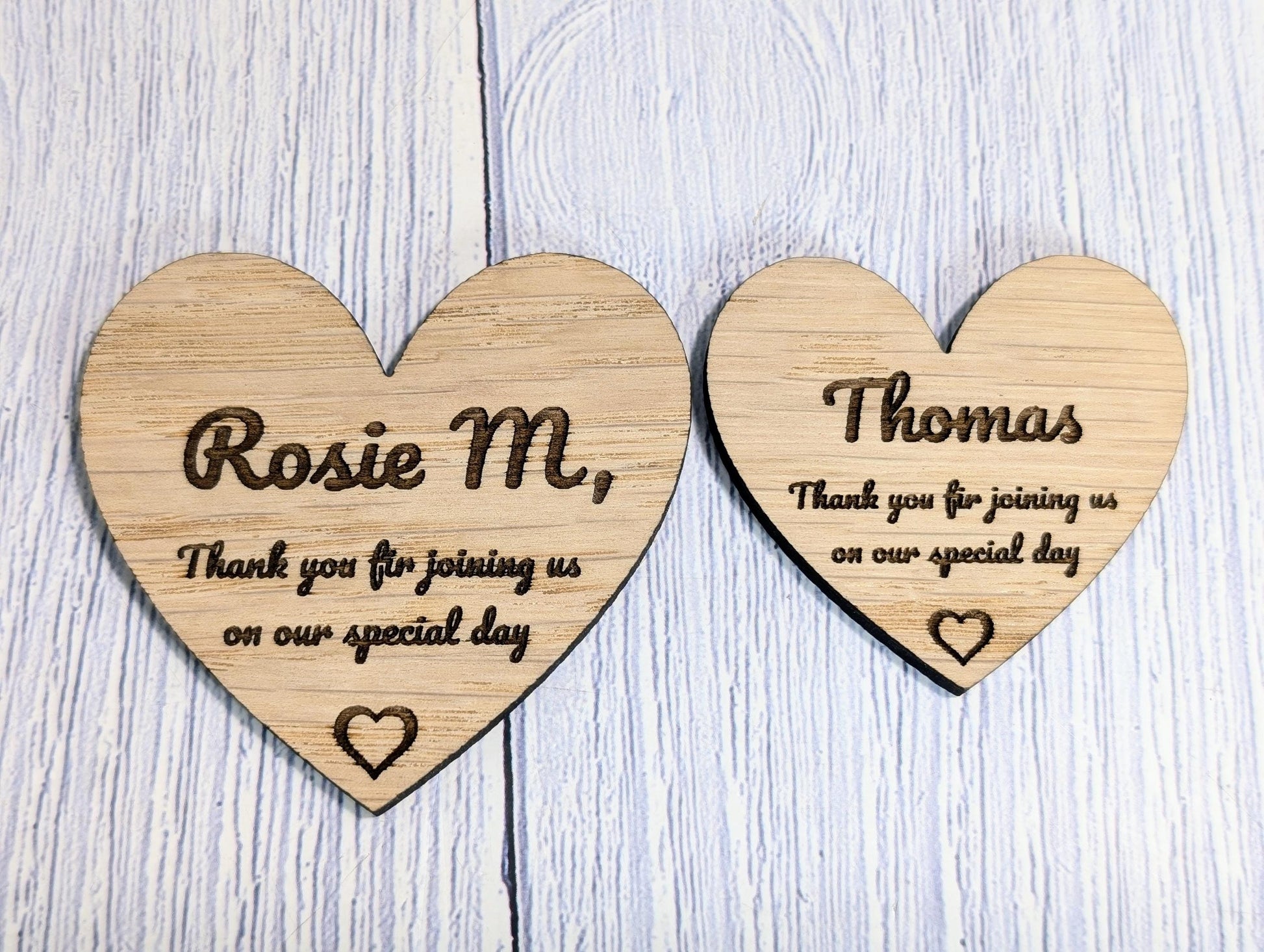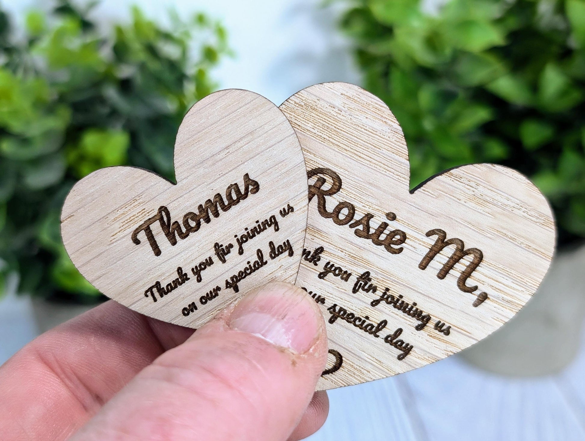 Wooden Heart Shaped Wedding Favours | 2 Sizes | Personalised Place Names | Custom Guest Name, Date | Eco-Friendly Oak Veneer Wood Keepsakes