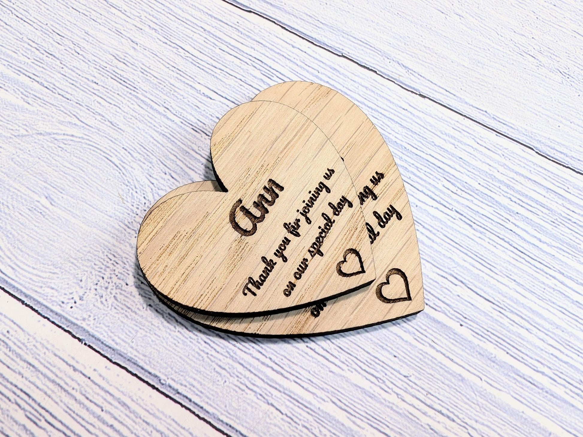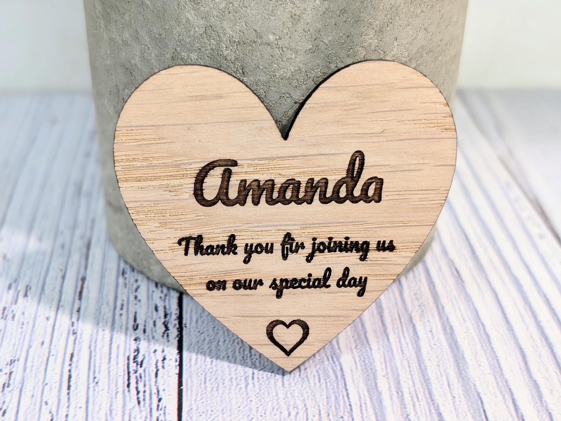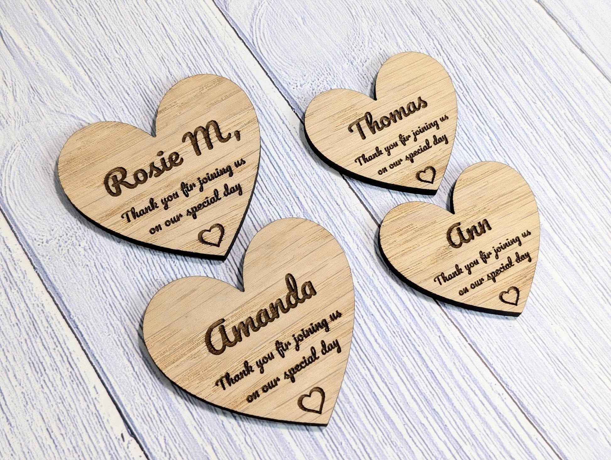 Wooden Heart Shaped Wedding Favours | 2 Sizes | Personalised Place Names | Custom Guest Name, Date | Eco-Friendly Oak Veneer Wood Keepsakes